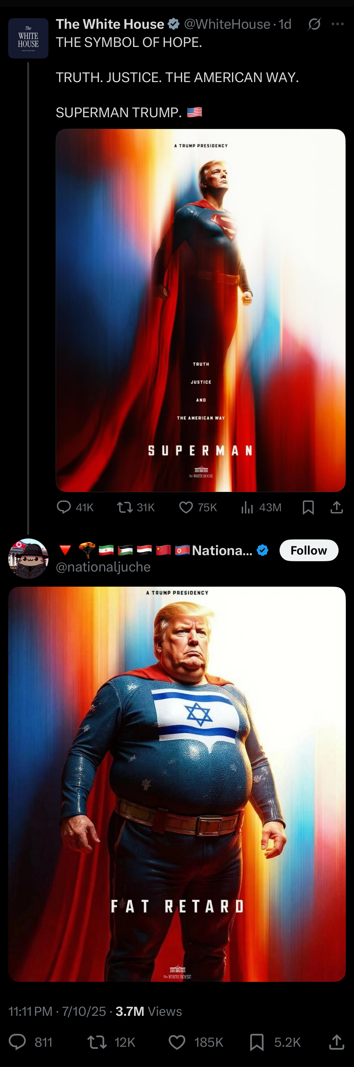 This week, in a somewhat related story, the official White House account on X has been ratio’d by a shitposter named National Juche. If you haven’t been following these developments, the official WH account has been posting some outrageous and extremely online memes in the last few weeks and months. Thinking further on the topics of comedy and ideology, we may soon find ourselves in a culture where these two categories are no longer so distinct. Instead, comedy, or art in general, may serve as the permissioned space in which to make political critiques that are not allowed elsewhere in society.